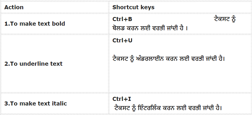 ਉੱਤਰ:- ਟੈਕਸਟ ਨੂੰ ਹਾਈਲਾਈਟ ਕਰਨ ਲਈ ਤਿੰਨ Shortcut Keys ਦੀ ਵਰਤੋਂ ਕੀਤੀ ਜਾਂਦੀ ਹੈ ਜੋ ਕਿ ਹੇਠ ਲਿਖੀਆਂ ਹਨ ।